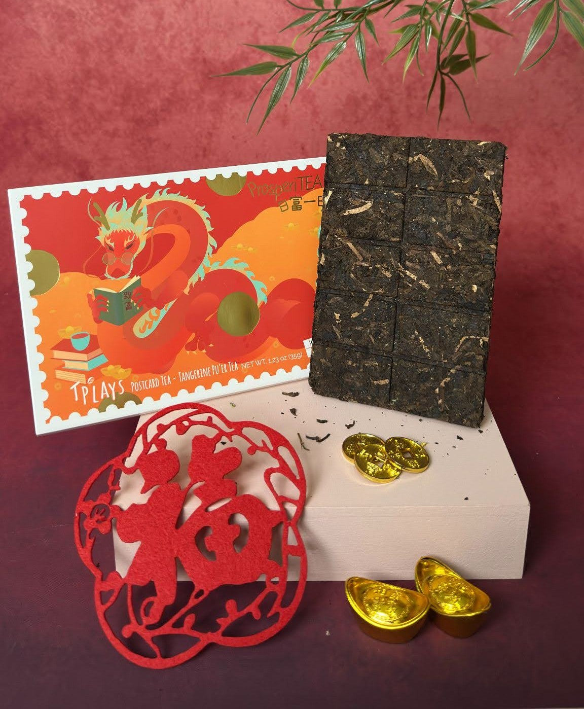 ProsperiTEA is a festive postcard filled with tangerine infused pu’er tea, made to be written, gifted, and brewed.