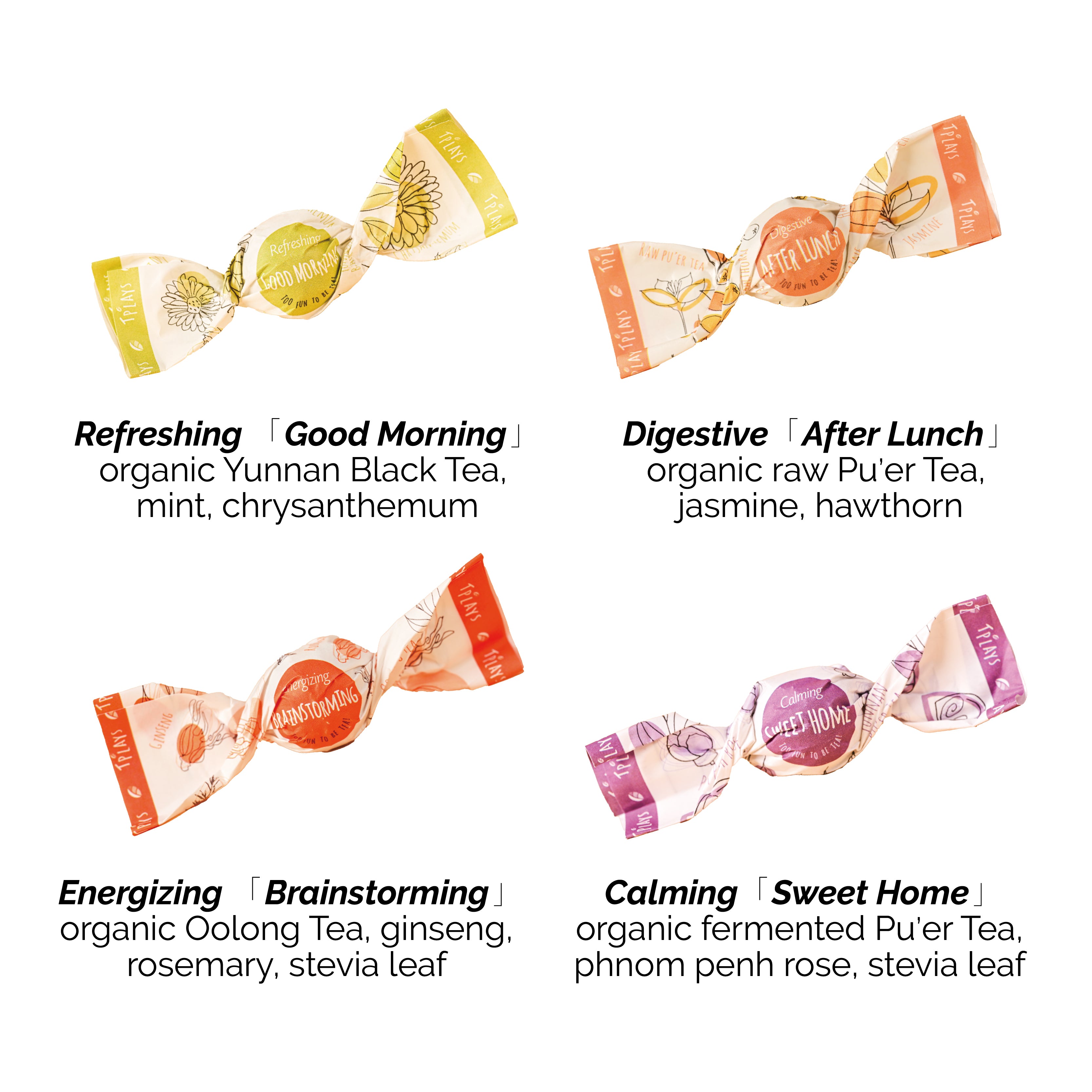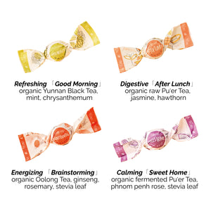 An elegant fusion of organic raw Pu’er tea, hawthorn, and jasmine flowers, pressed into playful bonbon shapes. Each bonbon brews up to 3 cups, offering a soothing, aromatic tea that balances earthy depth with floral brightness — a comforting ritual for after meals or mindful breaks.